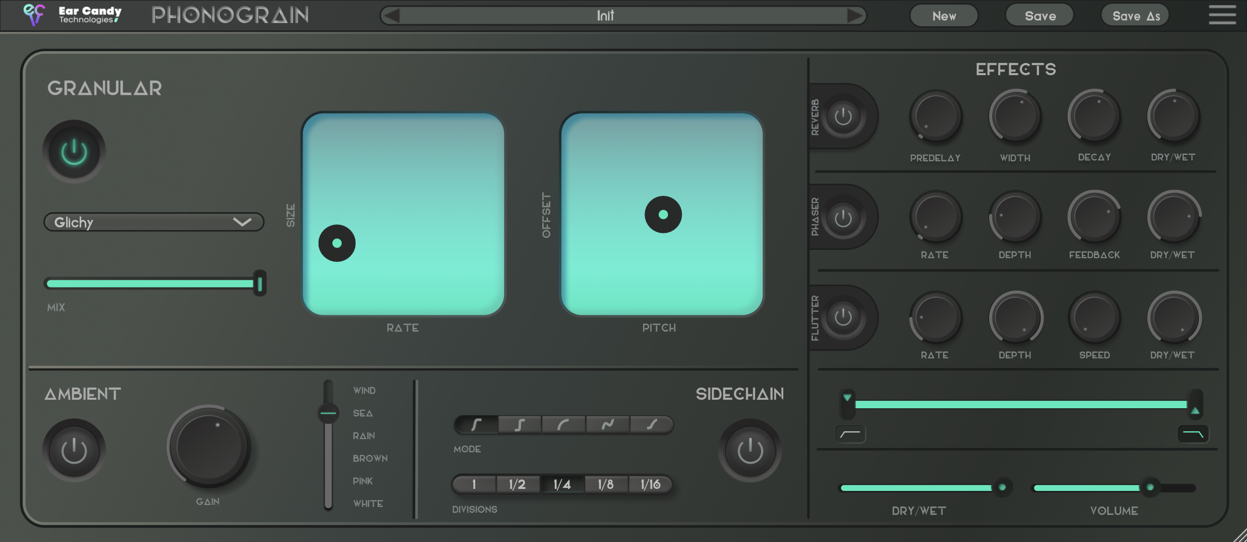 The Granular module is the core of Phonograin. Experiment with up to 5 high-quality granular algorithms. Play with size, pitch, rate and offset to chop and blend all at once.